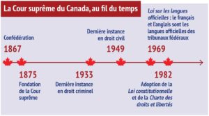 La Cour suprême du Canada est unique au monde : en plus d’être bilingue, elle est le seul tribunal de dernière instance bi juridique, c’est-à-dire qu’il y coexiste les deux traditions juridiques coloniales du pays, soit la common law d’Angleterre et le droit civil de France.