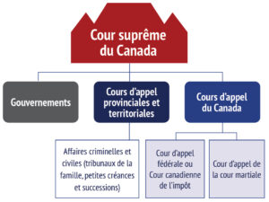 - Des cours fédérales. Les dossiers peuvent aussi venir de la Cour d’appel de la Cour martiale (tribunaux militaires) ou de la Cour d’appel fédérale (tribunaux administratifs fédéraux ou Cour canadienne de l’impôt).