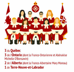 Outre les trois juges du Québec, la Cour en compte actuellement trois de l’Ontario (dont la Franco-Ontarienne et Abénakise Michelle O’Bonsawin), deux de l’Alberta (dont la Franco-Albertaine Mary Moreau) et un de Terre-Neuve-et-Labrador.